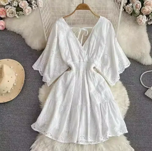 New Arrival Bohemian Casual Dress Fashionable Embroidery Lace V-Neck Hollow Mid Sleeve Translucent Features Natural Button